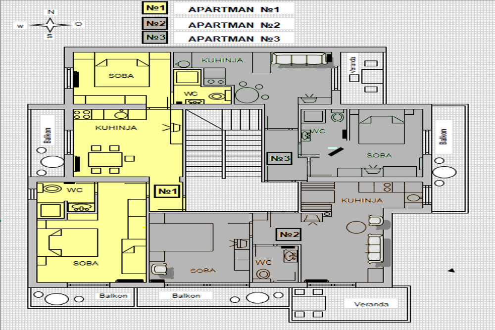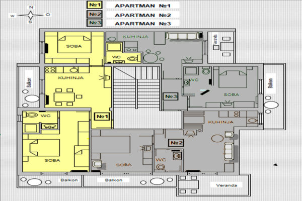 APARTMAN A1 (51m˛)- Soba 2+1 ležaj s WC i tušem, Soba 2 ležaja s WC i tušem, kuhinja s blagavaonom, balkon (5+5m˛) s južne i zapadne strane.